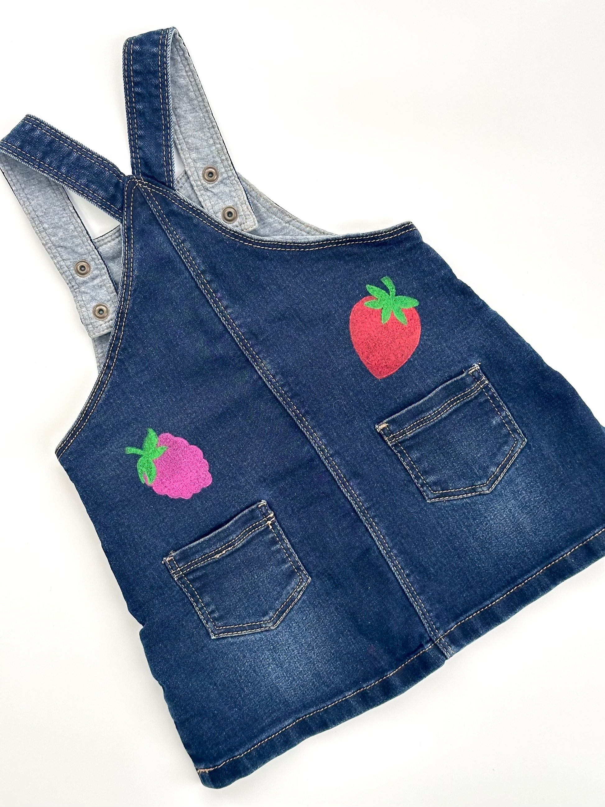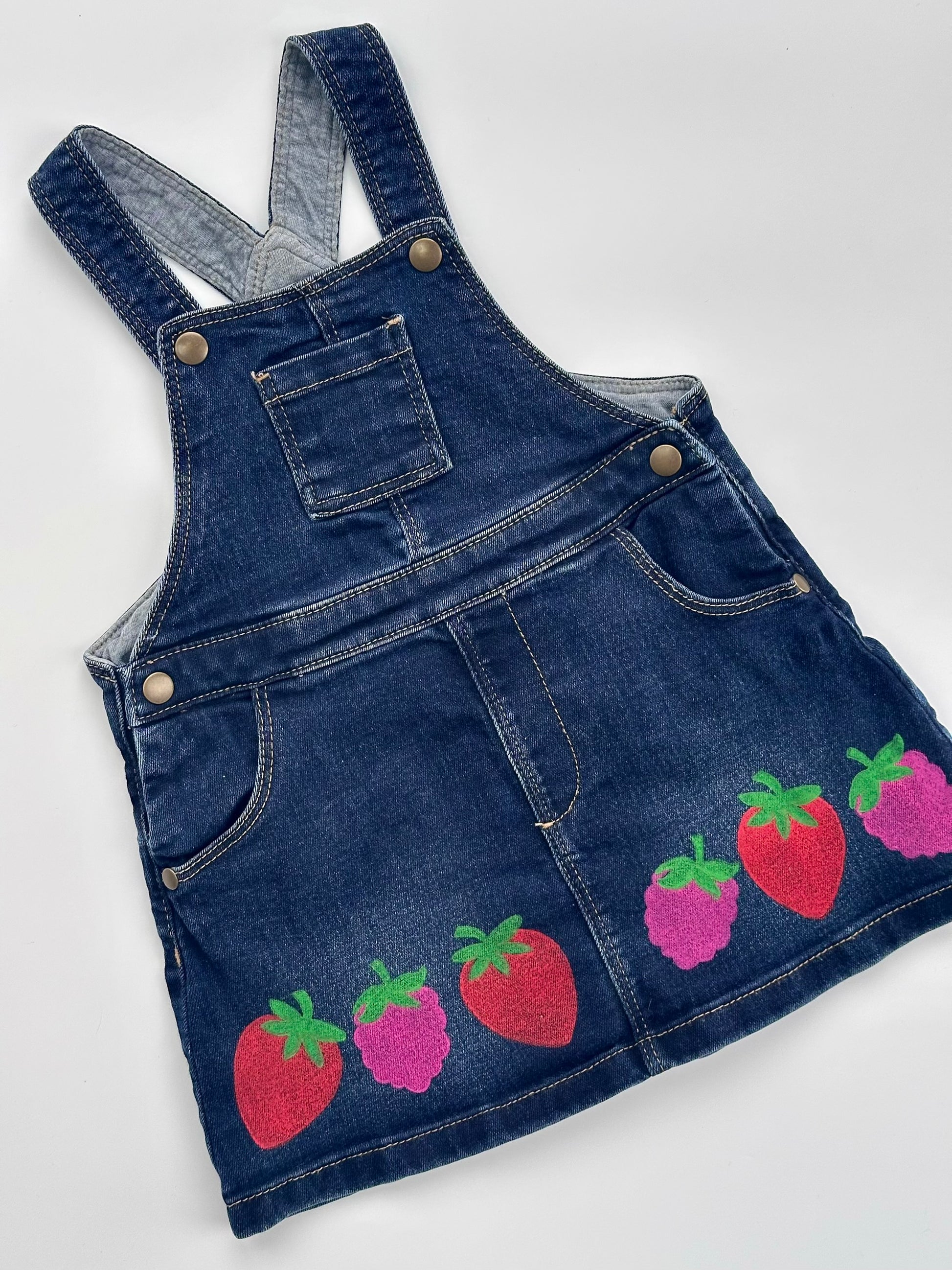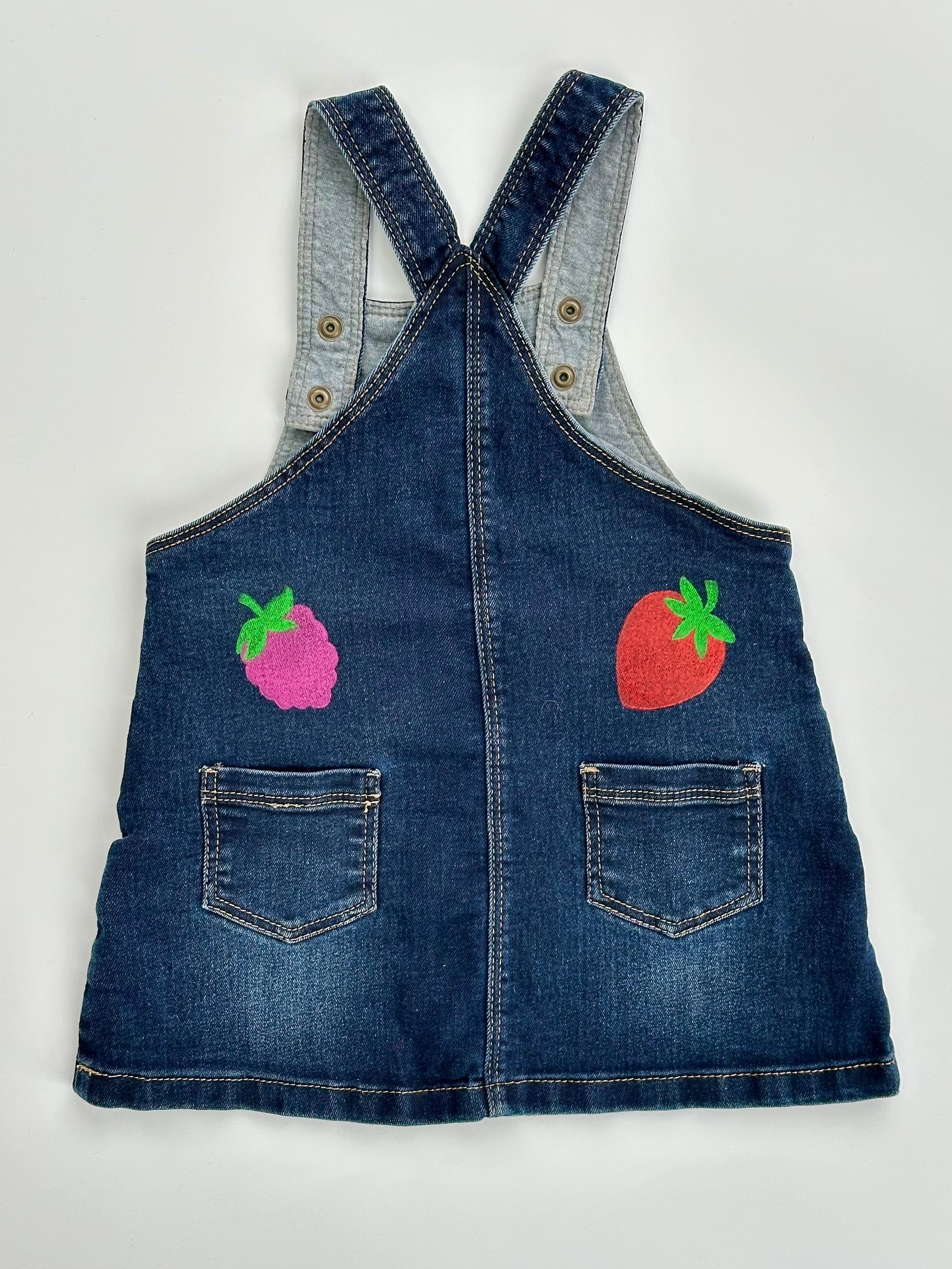 Marks & Spencer denim pinafore dress with hand-printed strawberry and raspberry motifs to the front and back.