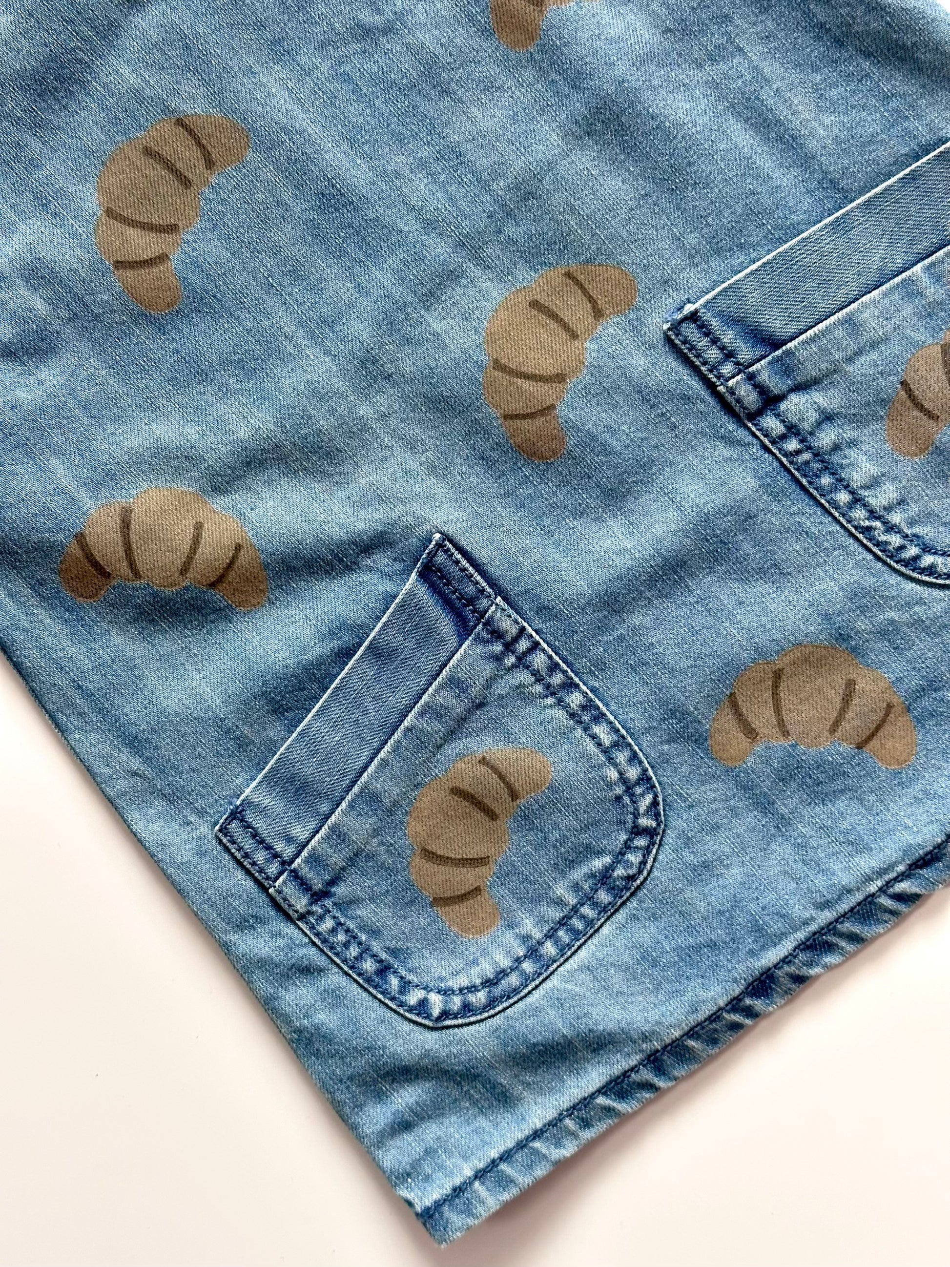 Next light denim dress with knotted strap details, hand printed with lots of croissant motifs to the front and back.