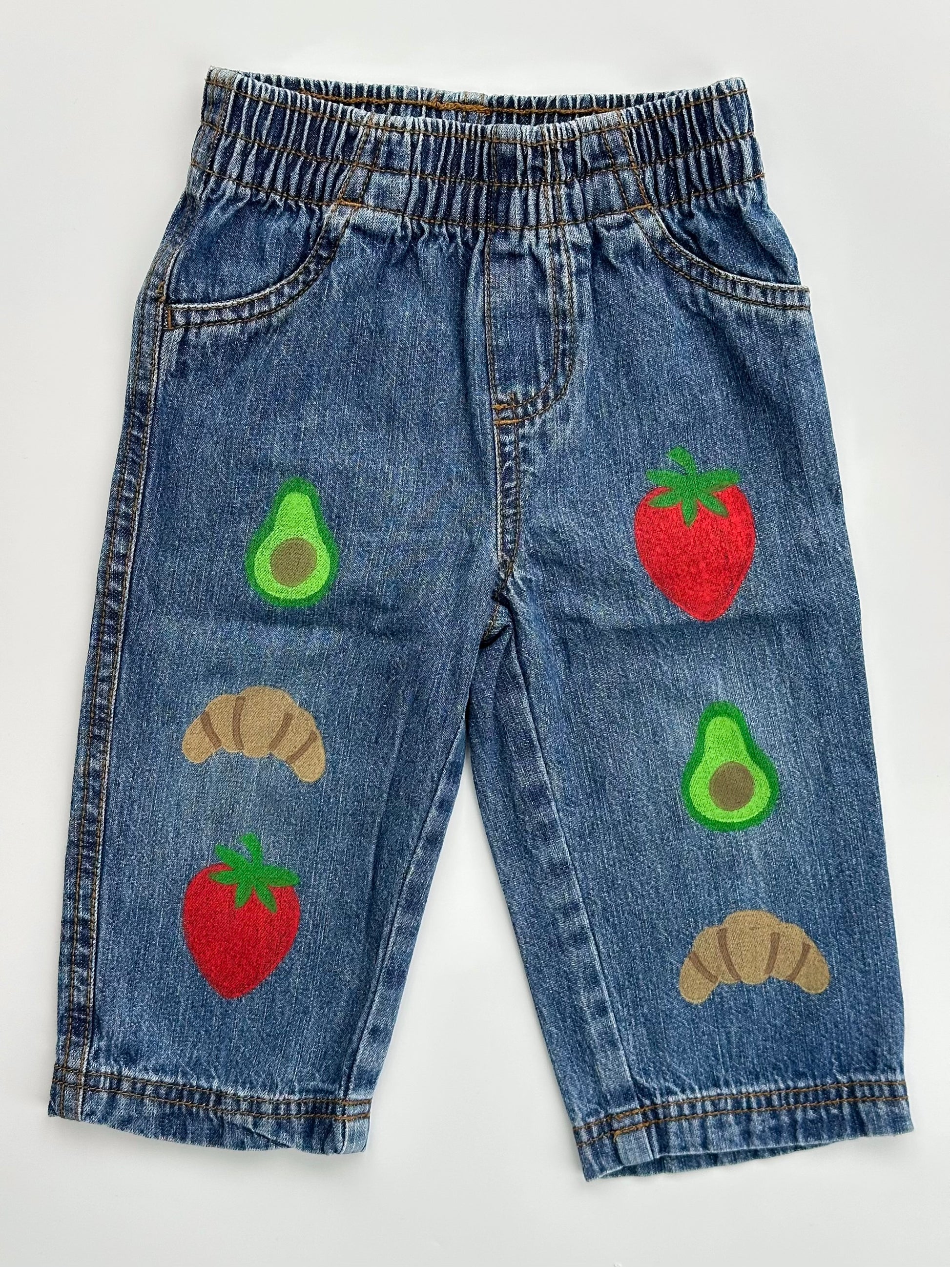 Unisex wide leg denim jeans with strawberry, avocado and croissant hand-printed motifs. Now your toddler can wear their favourite foods in more ways than one!